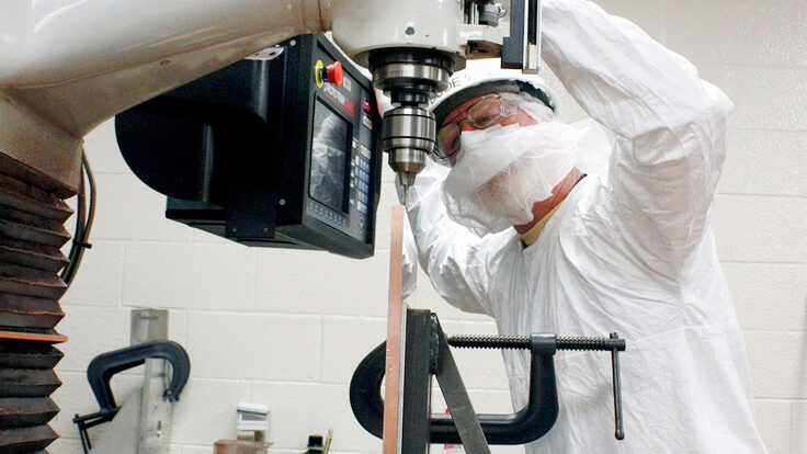 It is here that Randy Hughes comes to work every day and has for the last three years. He dons two pairs of booties, full white coveralls, glasses, two pairs of gloves and a facemask before he starts machining the majority of the pieces in the experiment, from thick shield plates to microscopic pins.